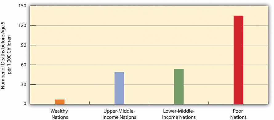 A key contributor to life expectancy and also a significant consequence of global poverty in its own right is child mortality, the number of children who die before age 5 per 1,000 children. As Figure 2.9 "Global Poverty and Child Mortality, 2006" shows, the rate of child mortality in poor nations is 135 per 1,000 children, meaning that 13.5 percent of all children in these nations die before age 5. In a few African nations, child mortality exceeds 200 per 1,000. In contrast, the rate in wealthy nations is only 7 per 1,000. Children in poor nations are thus about 19 times (13.5 ÷ 0.7) more likely to die before age 5 than children in wealthy nations.