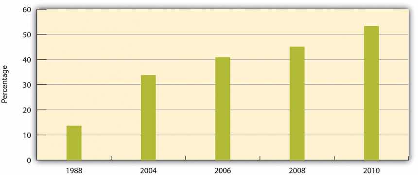 A first issue is same-sex marriage. The 2010 GSS asked whether respondents agree that “homosexual couples should have the right to marry one another”: 53.3 percent of respondents who expressed an opinion agreed with this statement, and 46.7 percent disagreed, indicating a slight majority in favor of legalizing same-sex marriage (SDA, 2010).SDA. (2010). GSS 1972–2010 cumulative datafile. Retrieved from http://sda.berkeley.edu/cgi-bin/hsda?harcsda+gss10. In 2011, an ABC News/Washington Post poll asked about same-sex marriage in a slightly different way: “Do you think it should be legal or illegal for gay and lesbian couples to get married?” A majority, 51 percent, of respondents replied “legal,” and 45 percent replied “illegal” (Langer, 2011).Langer, Gary. (2011). Support for gay marriage reaches a milestone. Retrieved from http://abcnews.go.com/Politics/support-gay-marriage-reaches-milestone-half-americans-support/story?id=13159608#.T66_kp9YtQp. Although only bare majorities now favor legalizing same-sex marriage, public views on this issue have become much more positive in recent years. We can see dramatic evidence of this trend in Figure 5.4 "Changes in Opinion about Same-Sex Marriage, 1988–2010 (Percentage Agreeing That Same-Sex Couples Should Have the Right to Marry; Those Expressing No Opinion Excluded from Analysis)", which shows that the percentage agreeing with the GSS question on the right of same-sex couples to marry has risen considerably during the past quarter-century.