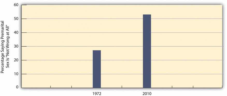 We can see evidence of changing views about sex in data from the General Social Survey (GSS), which has been administered nationally since the early 1970s. One of the questions the GSS asks is about premarital sex: “There’s been a lot of discussion about the way morals and attitudes about sex are changing in this country. If a man and woman have sex relations before marriage, do you think it is always wrong, almost always wrong, wrong only sometimes, or not wrong at all?” In 1972, only 27.2 percent of the public replied it was “not wrong at all,” but by 2010, this percentage almost doubled to 53.1 percent (see Figure 9.1 "Change in Views about Premarital Sex (Percentage Saying Premarital Sex Is “Not Wrong at All”)").