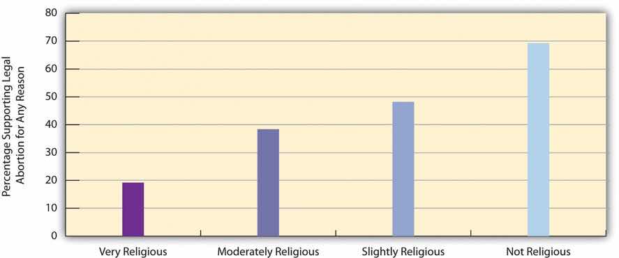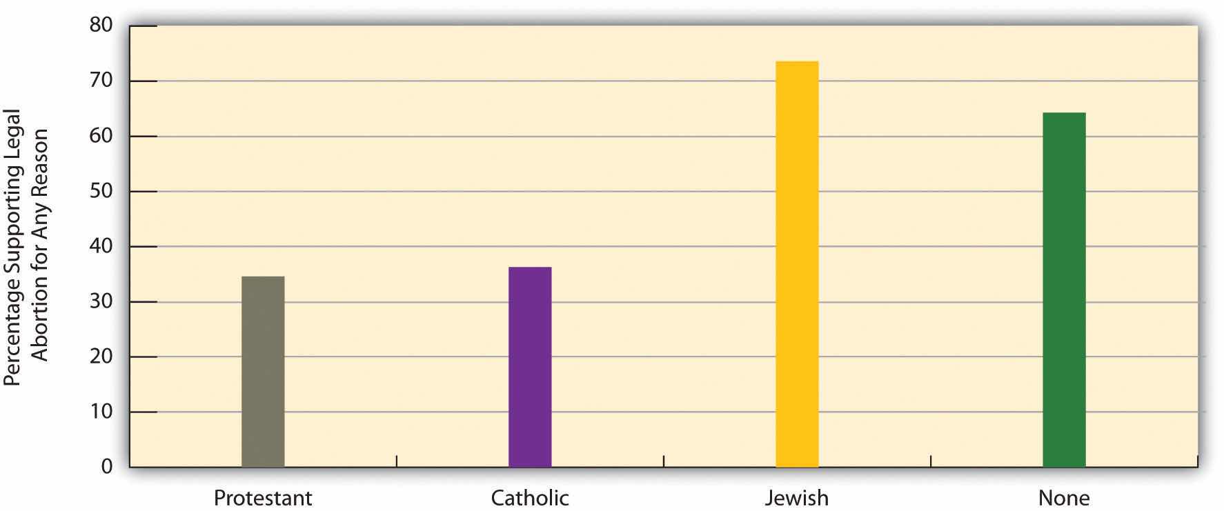 You have probably also heard many times that the Catholic Church is a leading opponent of legal abortion. Does this mean that Catholics themselves are less likely than Protestants to support legal abortion for any reason? The answer to this question is no: Figure 9.11 "Religious Preference and Support for Legal Abortion for Any Reason (%)" shows that Catholics and Protestants are about equally likely to favor legal abortion for any reason, with Jews and people with no religious preference about twice as likely to favor it.