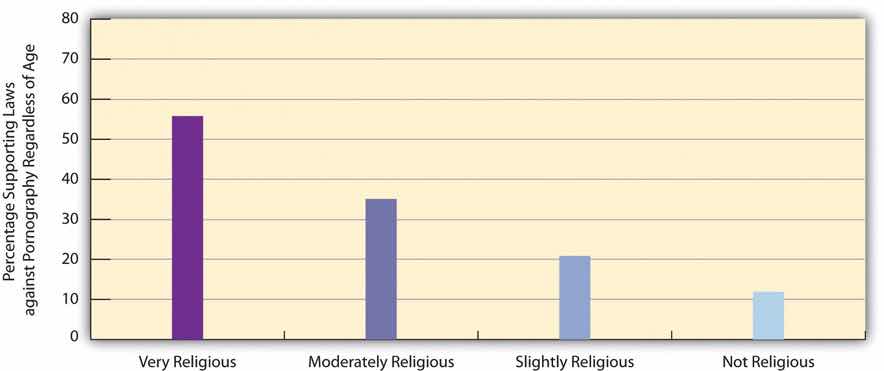 Certain aspects of our social backgrounds predict our views about pornography laws. Two of the strongest predictors are gender and religiosity. Focusing on the percentage who favor laws against pornography regardless of age, there is a strong gender difference in this view (see Figure 9.16 "Gender and Support for Laws against Pornography Regardless of Age (%)"), with women more than twice as likely than men to favor these laws. Religiosity also predicts support for pornography laws regardless of age: People who consider themselves very religious are five times more likely than those who consider themselves not religious to favor these laws (see Figure 9.17 "Self-Rated Religiosity and Support for Laws against Pornography Regardless of Age (%)").