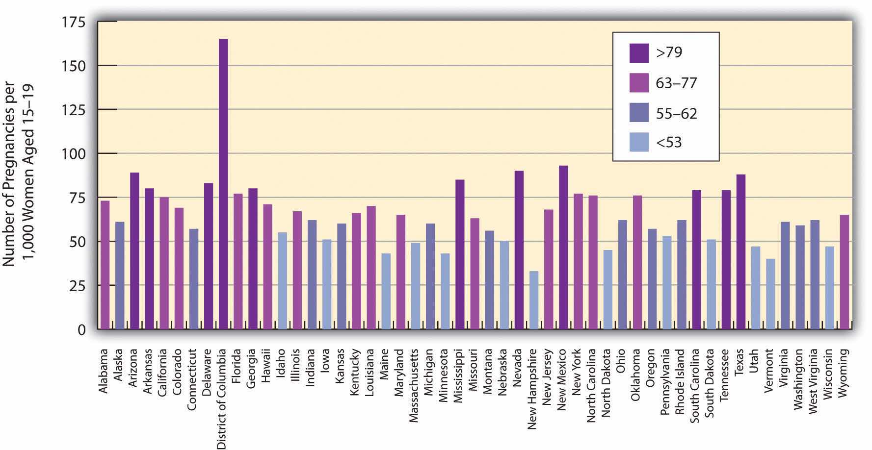 Large differences also exist in teenage pregnancy rates by state and the regions of the country into which the states fall. In general, the South has a higher teenage pregnancy rate than the rest of the nation (see Figure 9.7 "Teenage Pregnancy Rates in the United States, 2005 (Number of Pregnancies per 1,000 Women Aged 15–19)"), although there are individual differences by state. The South’s generally higher rate stems largely from its higher poverty rate and racial/ethnic composition. As the opening news story on Texas indicates, sex education programs emphasizing safe sex are also less common in Southern states than in many other states. The same difference holds for the provision of contraceptives by Planned Parenthood and other agencies and organizations. The lack of these two important pregnancy-prevention measures probably also contributes to the South’s higher teenage pregnancy rate.