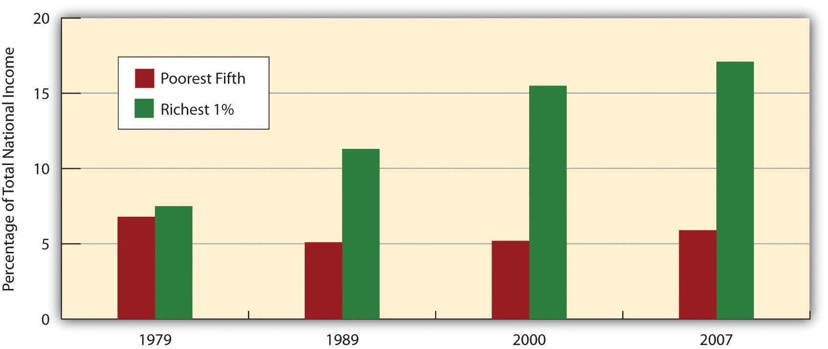 The lowering of tax rates has helped make the nation’s wealthiest families even wealthier. After adjusting for inflation, their after-tax income grew by a much greater amount than that for the poorest families from 1979 to 2007. Income grew by only 18 percent for the poorest fifth but by 65 percent for the wealthiest fifth (excluding the top 1 percent), and it also grew by a whopping 275 percent for families in the top 1 percent (Congressional Budget Office, 2011).Congressional Budget Office. (2011). Trends in the distribution of household income between 1979 and 2007. Retrieved from http://www.cbo.gov/ftpdocs/124xx/doc12485/WebSummary.pdf. As a result, economic inequality increased. Figure 12.6 "Growth of Economic Inequality in the United States (Percentage Share of Total National Income)" shows that wealthiest 1 percent now have a much larger share of the nation’s total posttax income than they did in 1979, while the poorest fifth have a lower share. As the saying goes, the rich get richer, and the poor get poorer.