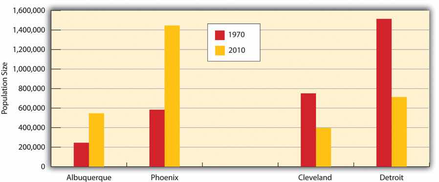 Note that the populations of New York and Chicago show some decline after 1950. This decline reflects two other trends affecting cities in the past half-century: (1) the movement of people from cities to suburbs; and (2) the movement of Americans from northern cities to southern and southwestern cities. Reflecting this second trend, and also reflecting increases in immigration from Mexico and Asia, southern and southwestern cities have grown rapidly during the past few decades. For example, during the 1970–2010 period, the populations of Albuquerque, New Mexico, and Phoenix, Arizona, more than doubled, while the populations of Cleveland, Ohio, and Detroit, Michigan, both fell by about half (see Figure 14.2 "Population Change from 1970 to 2010 for Selected Cities").