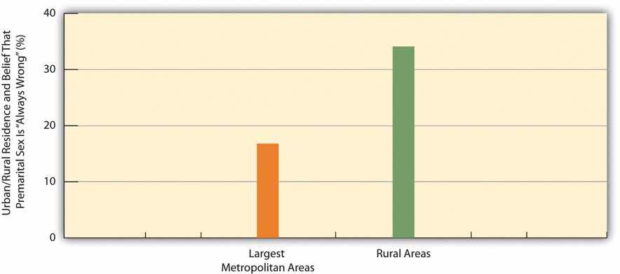 An example of the greater tolerance of urban residents (and thus the lower tolerance of rural residents) appears in Figure 14.5 "Urban/Rural Residence and Belief That Premarital Sex Is “Always Wrong” (%)", which depicts the percentage of Americans in the nation’s twelve largest metropolitan areas and in its rural areas who say that premarital sex is “always wrong.” Rural residents are twice as likely as urban residents to feel this way.