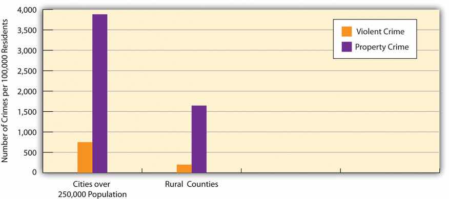 When many people think about the disadvantages of city life, they probably think about crime, a problem mentioned several times already in this chapter. Their fears are well grounded. Simply put, cities have much higher rates of violent and property crime than do small towns or rural areas (see Figure 14.6 "Crime Rates in Large Cities and Rural Counties, 2010 (Number of Crimes per 100,000 Residents)"). For example, the violent crime rate (number of crimes per 100,000 residents) in 2010 was almost four times higher in the nation’s largest cities than in its rural counties, while the property crime rate was more than twice as high.