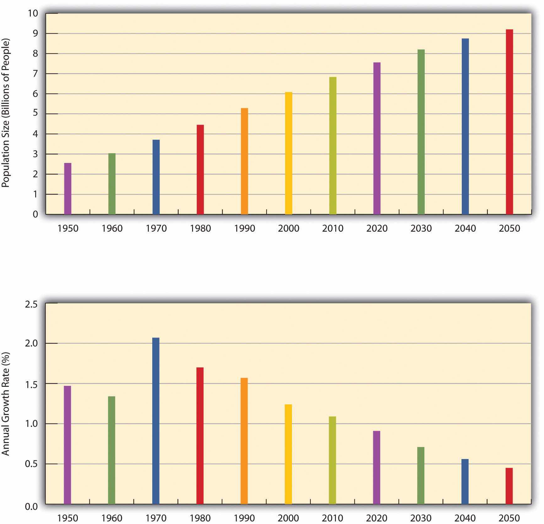 Eventually, however, population growth begins to level off after exploding, as explained by demographic transition theory, discussed later. We see this in the bottom half of Figure 15.4 "Total World Population, 1950–2050", which shows the average annual growth rate for the world’s population. This rate has declined over the last few decades and is projected to further decline over the next four decades. This means that while the world’s population will continue to grow during the foreseeable future, it will grow by a smaller rate as time goes by. As Figure 15.3 "International Annual Population Growth Rates (%), 2005–2010" suggested, the growth that does occur will be concentrated in the poor nations in Africa and some other parts of the world. Still, even in these nations the average number of children a woman has in her lifetime dropped from six a generation ago to about three today.