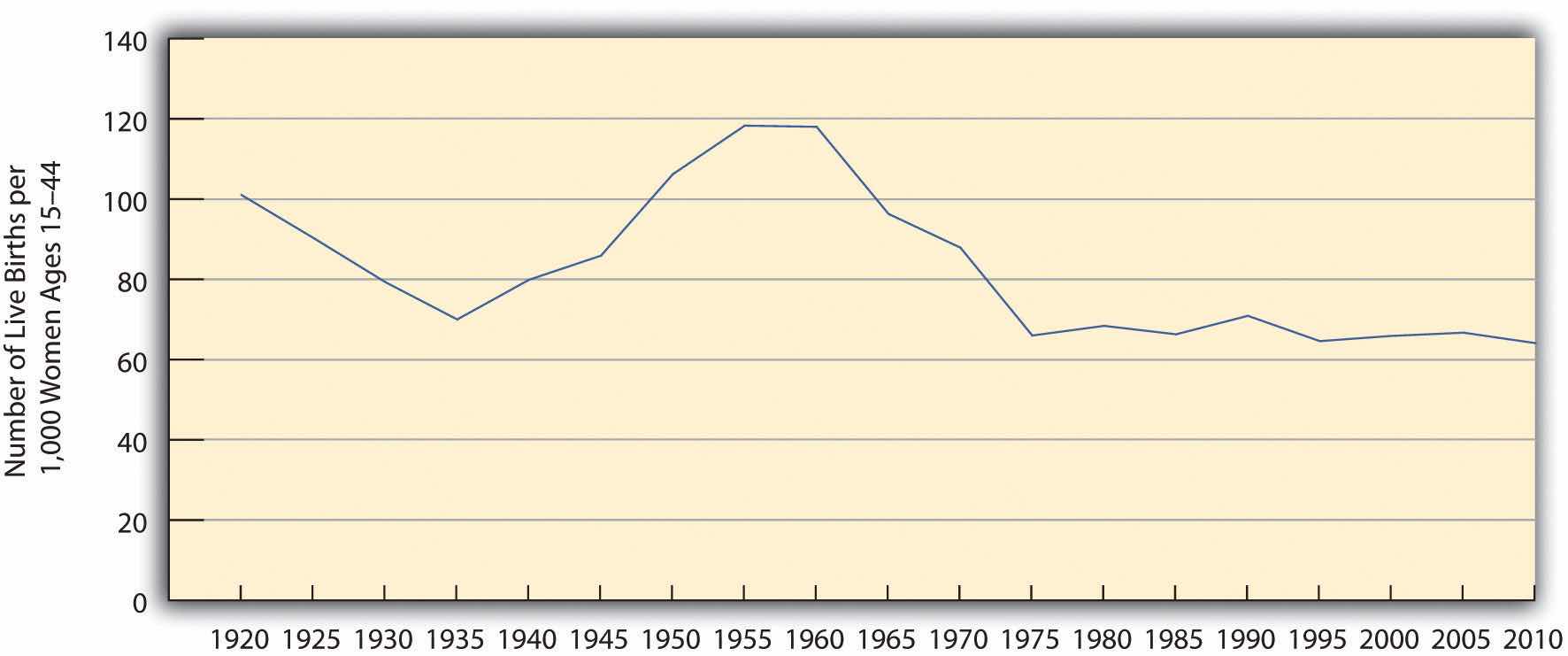 As Figure 15.1 "US General Fertility Rate, 1920–2010" indicates, the US general fertility rate has changed a lot since 1920, dropping from 101 (per 1,000 women aged 15–44) in 1920 to 70 in 1935, during the Great Depression, before rising afterward until 1955. (Note the very sharp increase from 1945 to 1955, as the post–World War II baby boom began.) The fertility rate then fell steadily after 1960 until the 1970s but has remained rather steady since then, fluctuating only slightly between 65 and 70 per 1,000 women aged 15–44.