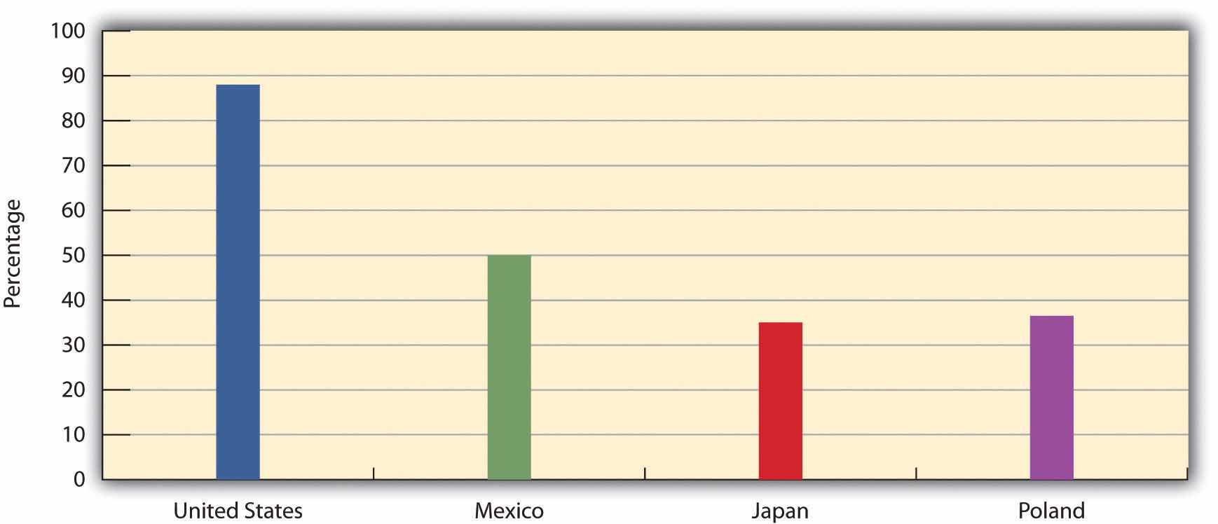 Figure 3.4 "Percentage of People Who Think Competition Is Very Beneficial" illustrates this difference between the two nations’ cultures with data from the 2002 World Values Survey (WVS), which was administered to random samples of the adult populations of more than 80 nations around the world. One question asked in these nations was, “On a scale of one (‘competition is good; it stimulates people to work hard and develop new ideas’) to ten (‘competition is harmful; it brings out the worst in people’), please indicate your views on competition.” Figure 3.4 "Percentage of People Who Think Competition Is Very Beneficial" shows the percentages of Americans and Japanese who responded with a “one” or “two” to this question, indicating they think competition is very beneficial. Americans are about three times as likely as Japanese to favor competition.
