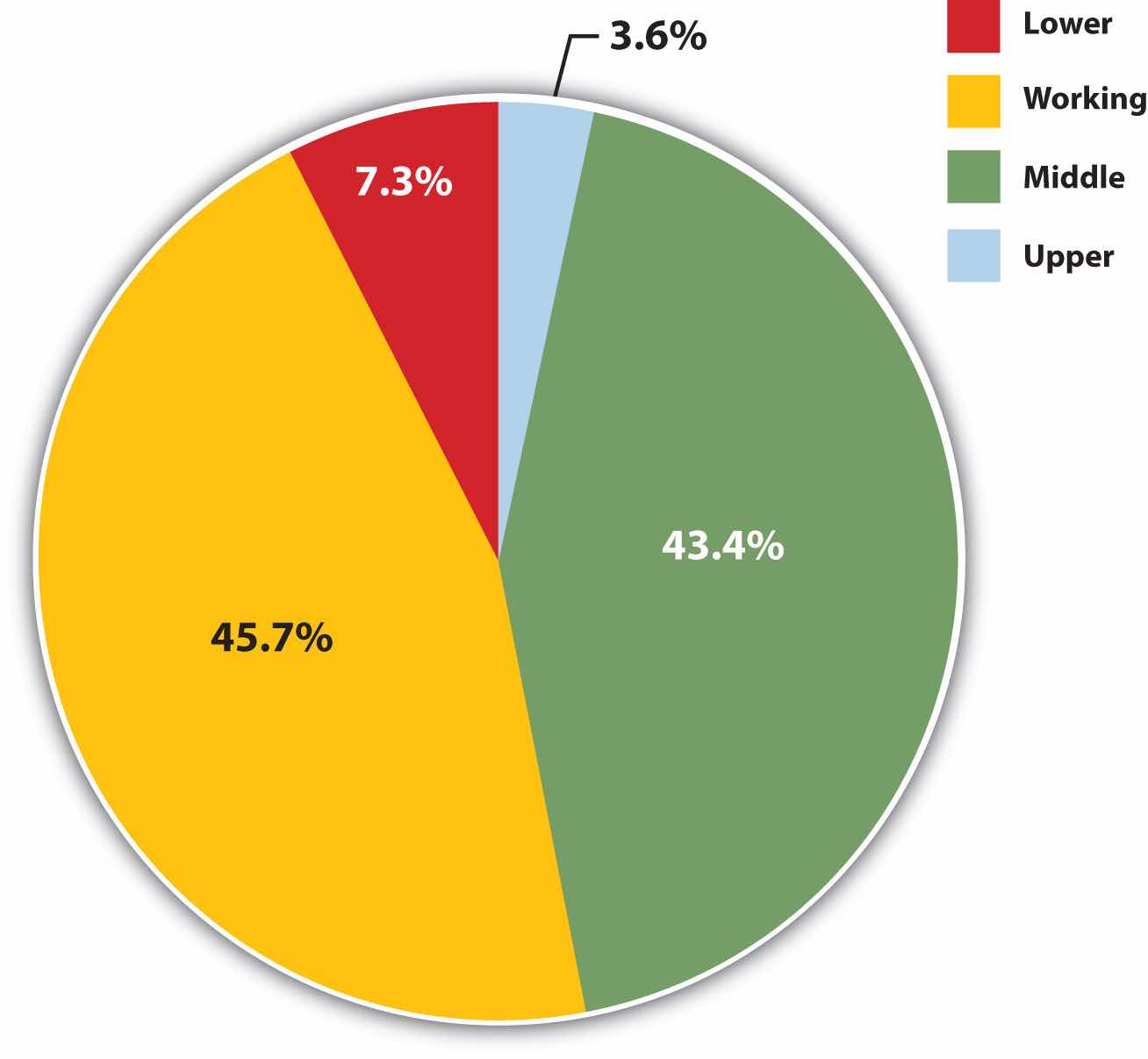 As should be evident, it is not easy to determine how many social classes exist in the United States. Over the decades, sociologists have outlined as many as six or seven social classes based on such things as, once again, education, occupation, and income, but also on lifestyle, the schools people’s children attend, a family’s reputation in the community, how “old” or “new” people’s wealth is, and so forth (Coleman & Rainwater, 1978; Warner & Lunt, 1941).Coleman, R. P., & Rainwater, L. (1978). Social standing in America. New York, NY: Basic Books; Warner, W. L., & Lunt, P. S. (1941). The social life of a modern community. New Haven, CT: Yale University Press. For the sake of clarity, we will limit ourselves to the four social classes included in Figure 8.3 "Subjective Social Class Membership": the upper class, the middle class, the working class, and the lower class. Although subcategories exist within some of these broad categories, they still capture the most important differences in the American class structure (Gilbert, 2011).Gilbert, D. (2011). The American class structure in an age of growing inequality (8th ed.). Thousand Oaks, CA: Pine Forge Press. The annual income categories listed for each class are admittedly somewhat arbitrary but are based on the percentage of households above or below a specific income level.