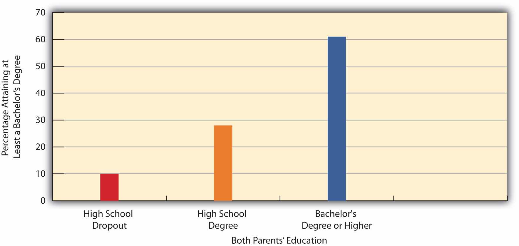 As Figure 8.5 "Parents’ Education and Percentage of Respondents Who Have a College Degree" indicates, we are much more likely to get a college degree if our parents had college degrees themselves. The two bars for respondents whose parents were high school graduates or dropouts, respectively, do represent upward mobility, because the respondents are graduating from college even though their parents did not. But the three bars taken together also show that our chances of going to college depend heavily on our parents’ education (and presumably their income and other aspects of our family backgrounds). The American Dream does exist, but it is much more likely to remain only a dream unless we come from advantaged backgrounds. In fact, there is less vertical mobility in the United States than in other Western democracies. As a recent analysis summarized the evidence, “There is considerably more mobility in most of the other developed economies of Europe and Scandinavia than in the United States” (Mishel, Bernstein, & Shierholz, 2009, p. 108).Mishel, L., Bernstein, J., & Shierholz, H. (2009). The state of working America 2008/2009. Ithaca, NY: ILR Press [An imprint of Cornell University Press].