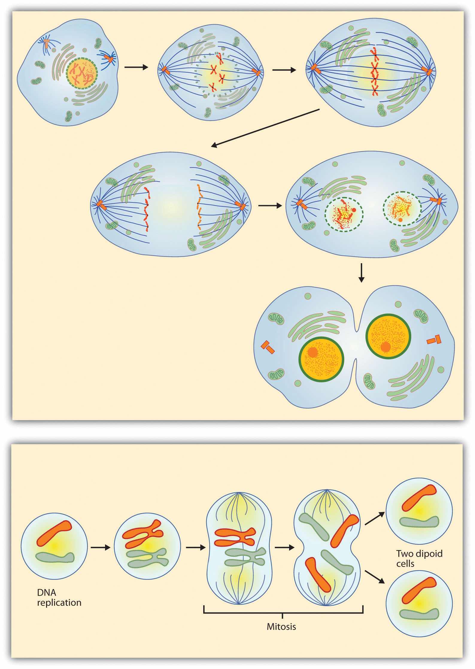Source: Images courtesy of LadyofHats, http://commons.wikimedia.org/wiki/File:MITOSIS_cells_secuence.svg, and the National Institutes of Health, http://commons.wikimedia.org/wiki/File:MajorEventsInMitosis.jpg.