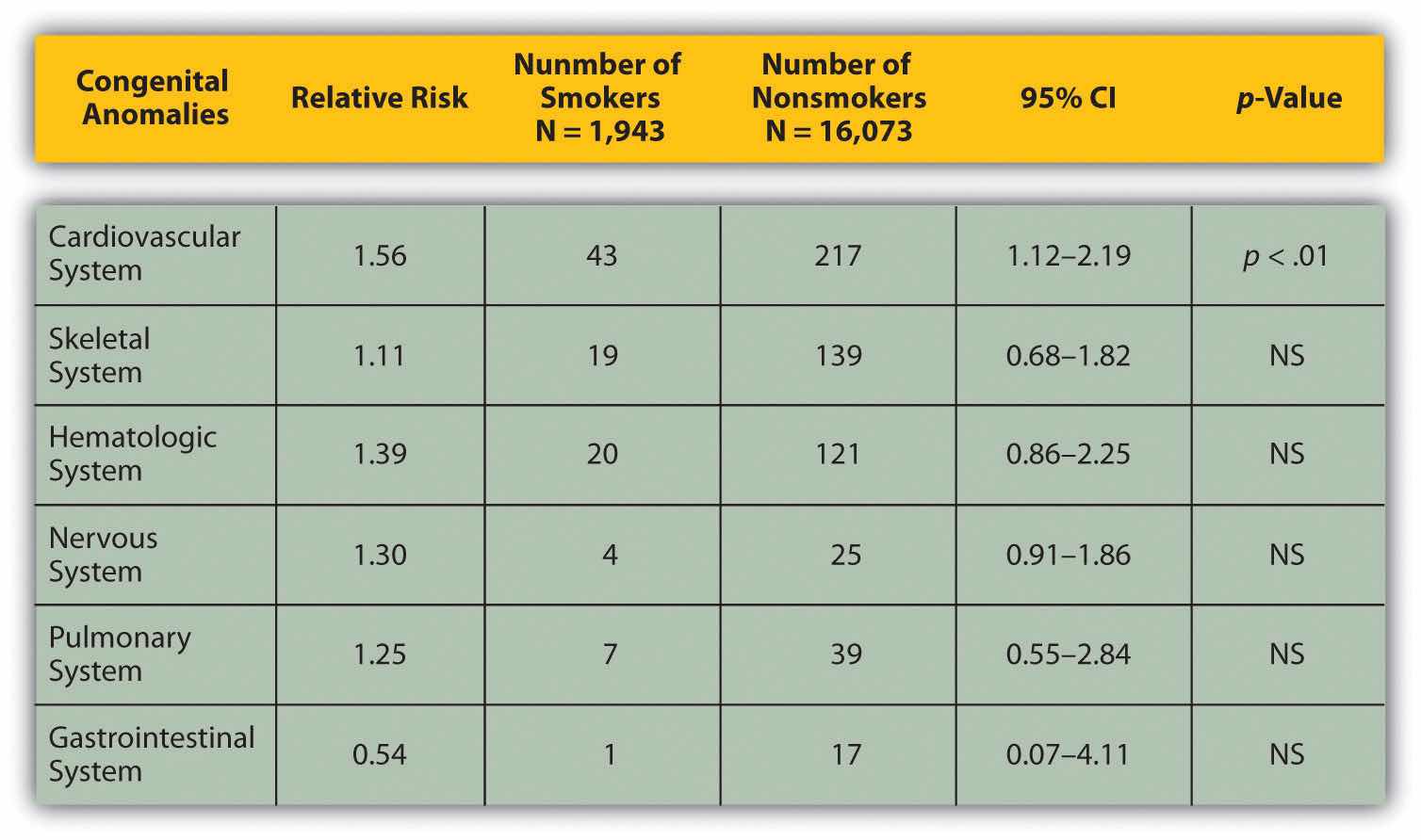 Source: Woods, S. E., & Raju, U. (2001). Maternal smoking and the risk of congenital birth defects: A cohort study. Journal of the American Board of Family Practitioners, 14, 330–334.