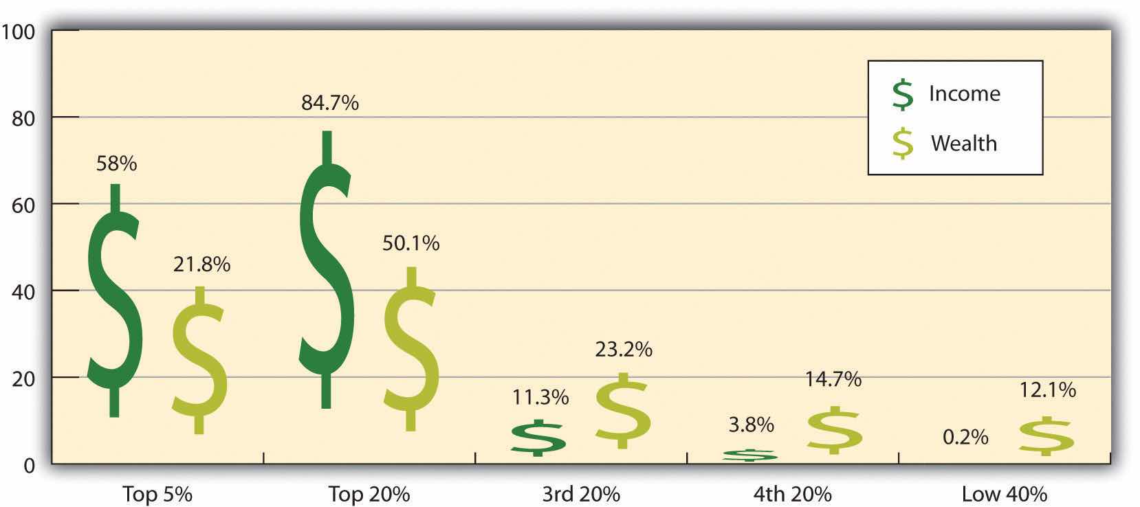 The graph in Figure 15.12 "Distribution of Income and Wealth in the United States" is a complicated bar graph depicting the disparity between the haves and the have nots within the United States. On the left hand side of the graph you can see that the Top 20% of people within the United States account for 84.7% of all of the wealth and 50.1% of all of the income. On the other hand, those in the bottom 40% account for only 0.2% of the wealth and 12.1% of the actual income.