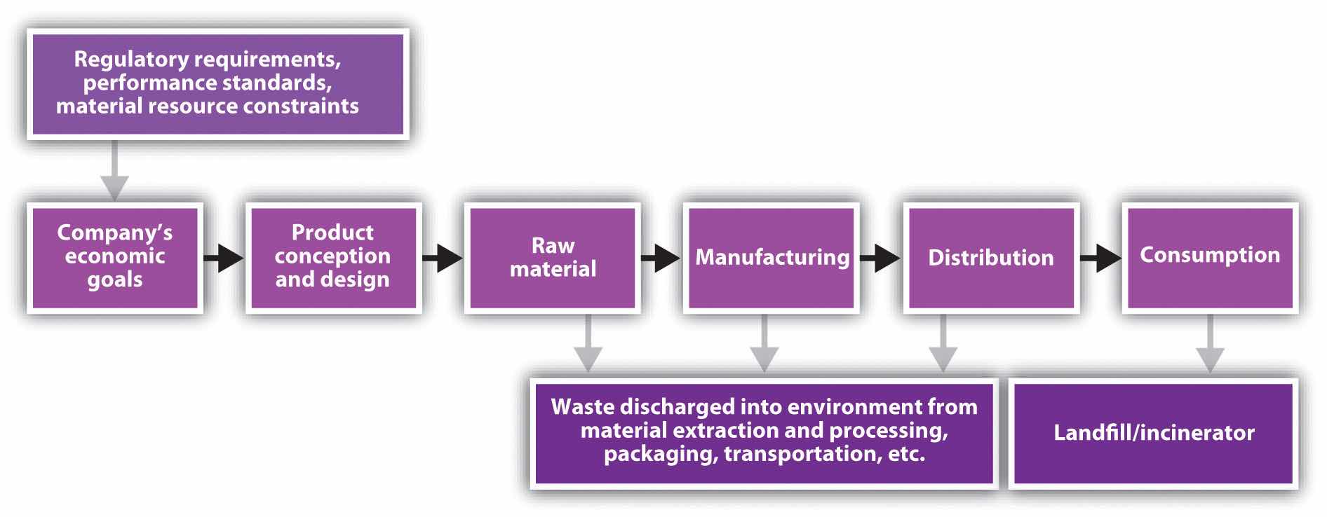 A company that sells a final product must meet certain requirements and interact with suppliers, third-party logistics providers, and other stakeholder groups that can influence the entire process. Each institution tries to shape the supply chain to its own advantage. As the product moves from design to consumption (black arrows), waste and other problems (gray arrows) accrue. Whether those problems are unfair wages, deforestation, or air pollution, these costs are not necessarily reflected in the price of the finished product but are instead externalized to the public in some fashion or expected to be borne by intermediate links in the conventional chain.