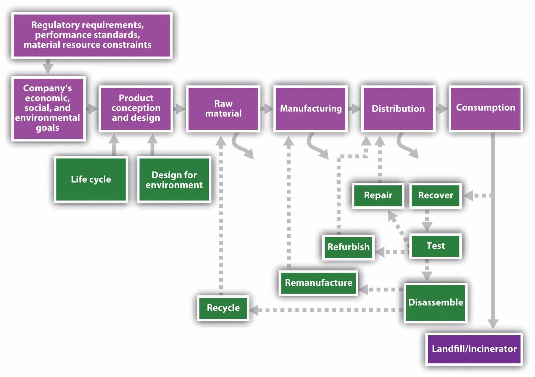 In addition to dramatically improving conventional supply-chain logistics, green supply chains extend past the point of product use, where conventional chains end, and consider how to recover and reuse materials—questions of reverse logisticsThe part of the supply chain that takes used products from consumers and recycles, refurbishes, or otherwise disposes of those products.. Many companies already have rudimentary reverse logistics systems to deal with customers’ returns of items they do not want or that were found defective or otherwise unsatisfactory. An expanded reverse logistics system would ultimately replace the linearity of most production methods—raw materials, to processing, to further conversions and modification, to ultimate product, to use, to disposal—with a cradle-to-cradle, cyclical path or closed loop that begins with the return of used, outmoded, out-of-fashion, and otherwise “consumed” products. The products are either recycled and placed back into the manufacturing stream or broken down into compostable materials. The cycle is never ending because materials return to the land in safe molecular structures (taken up and used by organisms as biological nutrients) or are perpetually used within the economy as input for new products (technical nutrients).