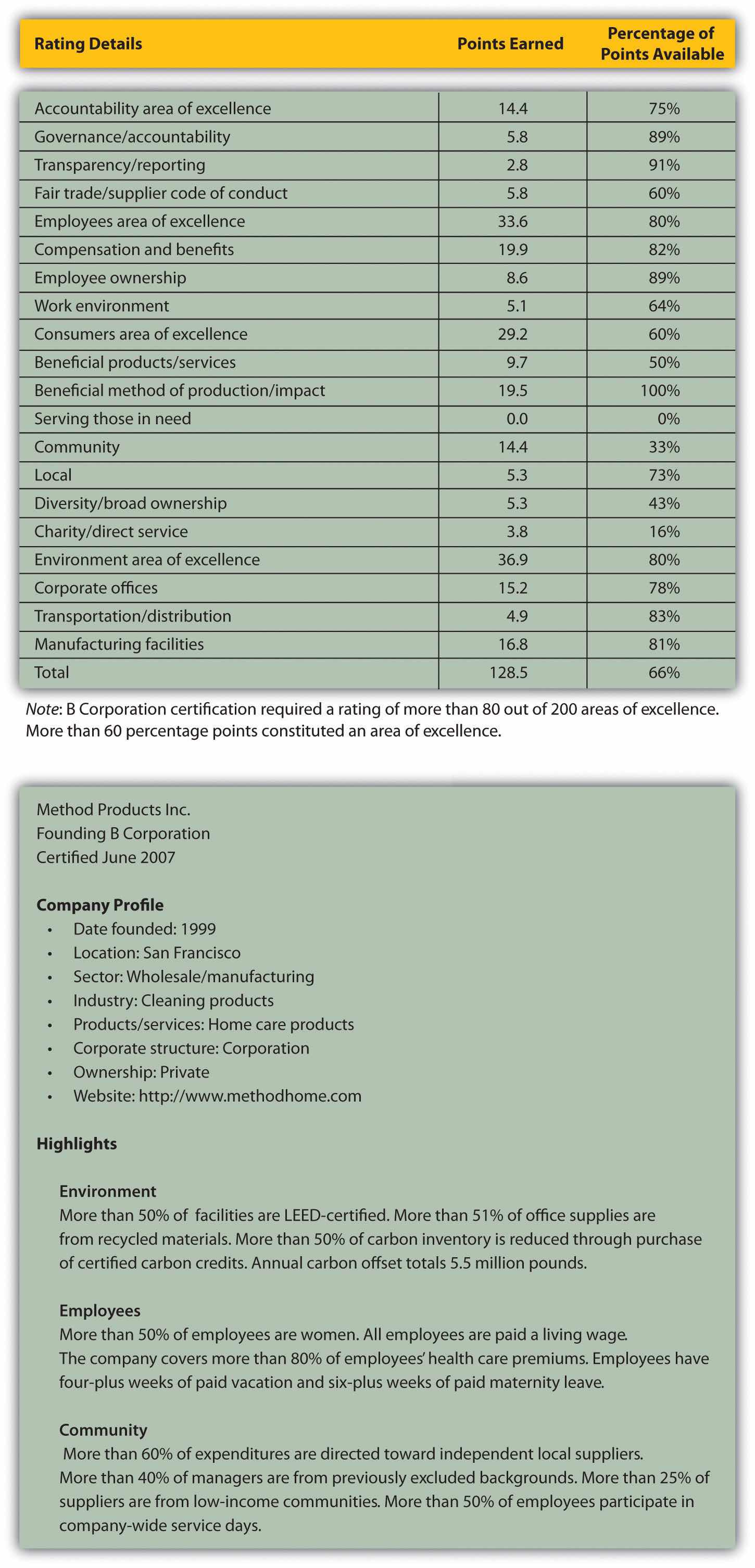 Source: B Lab, “Method Products, Inc.,” accessed April 19, 2010, http://www.bcorporation.net/index.cfm/fuseaction/company.report/ID/4f591f09-826c-4848-b89d-762456162efc.