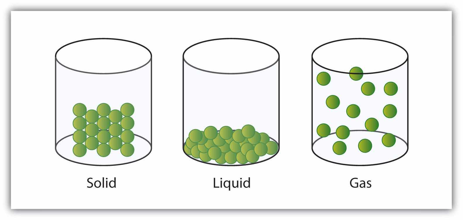 A phaseA form of matter that has the same physical properties throughout. is a certain form of matter that includes a specific set of physical properties. That is, the atoms, the molecules, or the ions that make up the phase do so in a consistent manner throughout the phase. As mentioned in Chapter 1 "Chemistry, Matter, and Measurement", science recognizes three stable phases: the solid phase, in which individual particles can be thought of as in contact and held in place; the liquid phase, in which individual particles are in contact but moving with respect to each other; and the gas phase, in which individual particles are separated from each other by relatively large distances. Not all substances will readily exhibit all phases. For example, carbon dioxide does not exhibit a liquid phase unless the pressure is greater than about six times normal atmospheric pressure. Other substances, especially complex organic molecules, may decompose at higher temperatures, rather than becoming a liquid or a gas.