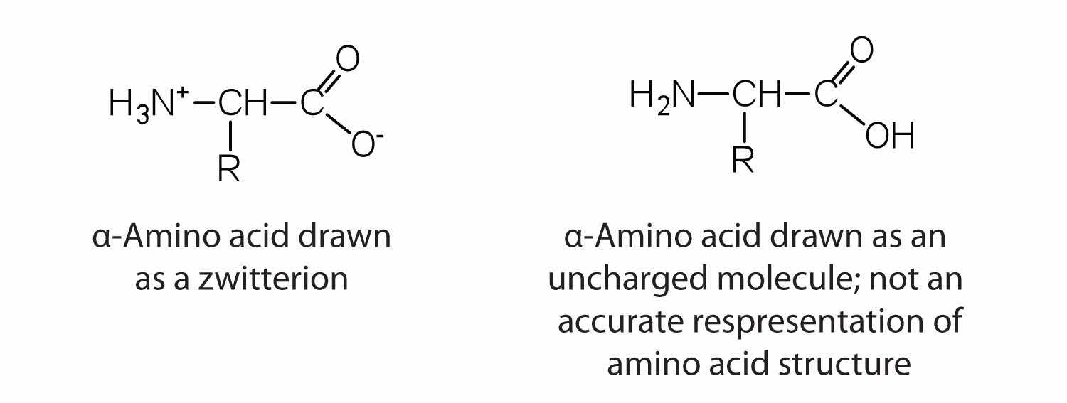 The amino acids are colorless, nonvolatile, crystalline solids, melting and decomposing at temperatures above 200°C. These melting temperatures are more like those of inorganic salts than those of amines or organic acids and indicate that the structures of the amino acids in the solid state and in neutral solution are best represented as having both a negatively charged group and a positively charged group. Such a species is known as a zwitterionAn electrically neutral compound that contains both negatively and positively charged groups..