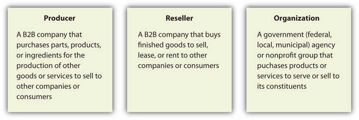 Companies that buy products to make or build a product or service to sell for a profit are called producersA B2B company that purchases parts, products, or ingredients for the production of other goods or services to sell at a profit.. For example, in the case of Reebok, the company purchases components for its athletic shoes from a variety of vendors around the world. Reebok uses the components to manufacture the shoes and sell them to retailers such as Foot Locker, which in turn, sell the shoes to consumers like you. In this example, Reebok is engaged in B2B buying as a producer because the company purchases parts or materials to make shoes and then sells them to other companies.Barton A. Weitz, Stephen B. Castleberry, and John F. Tanner, Jr., Selling: Building Partnerships, 7th ed. (New York: McGraw-Hill Irwin, 2009), 86. Reebok is a B2B purchaser but not a B2C seller; the company markets its brand directly to B2C consumers to gain recognition and drive consumers to participate in B2C buying at retailers that carry its brand.
