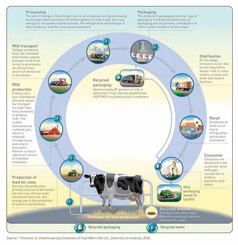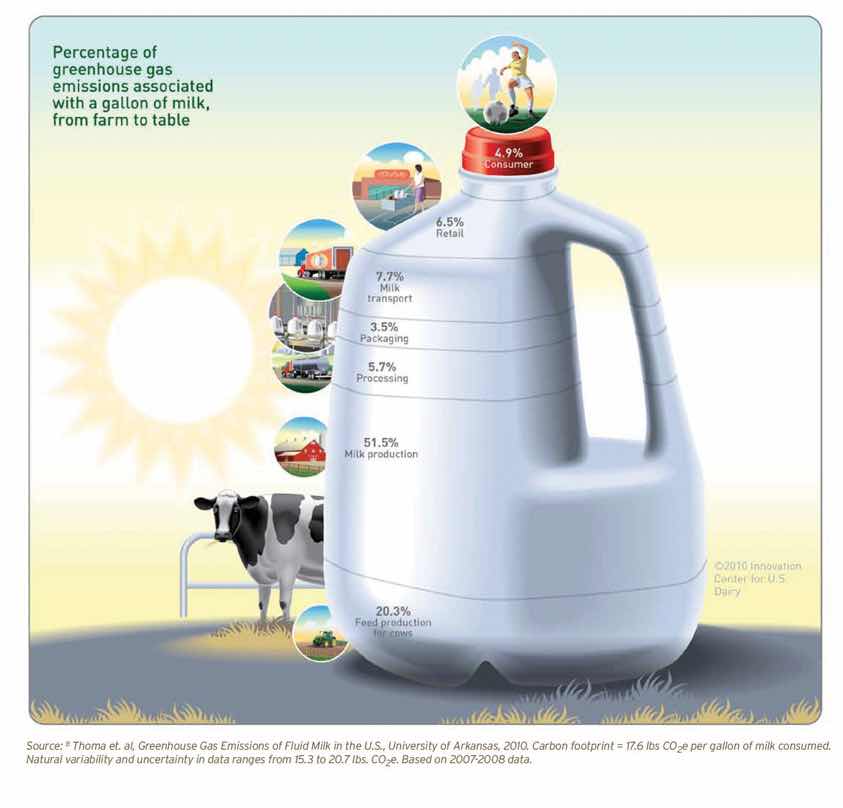 In December 2010, the Innovation Center for US Dairy published its first US Dairy Industry Sustainability Commitment Report. The report was a collaborative effort of leaders and experts in and outside the industry who joined together to “identify and deploy sustainability innovations that make good business sense.” The report documented that the United States was the largest dairy producer in the world, producing annually 189.9 billion pounds of milk and that milk was the fourth highest dollar value agricultural product in the United States (at 8 percent of total receipts). It also identified that the dairy industry contributed 2 percent of the total US GHG emissions. Working with the Sustainability Center at the University of Arkansas, the Innovation Center conducted the dairy industry’s first national GHG life cycle analysis (LCA)A technique to assess each and every impact associated with all the stages of a process from cradle to grave (i.e., from raw materials through materials processing, manufacture, distribution, use, repair and maintenance, and disposal or recycling). LCAs can help avoid a narrow outlook on environmental, social, and economic concerns. This is achieved by compiling an inventory of relevant energy, material inputs, and environmental releases; evaluating the potential impacts associated with identified inputs and releases; and interpreting the results to help you make a more informed decision., or carbon footprintA carbon footprint is “the total set of greenhouse gases (GHG) emissions caused by an organization, event, or product.” For simplicity of reporting, it is often expressed in terms of the amount of carbon dioxide, or other equivalent GHGs, emitted. study, of fluid milk.Innovation Center for US Dairy, U.S. Dairy Sustainability Commitment Progress Report: Sustaining the Dairy Industry for Future Generations, accessed January 9, 2011, http://www.usdairy.com/Sustainability/Pages/Home.aspx.