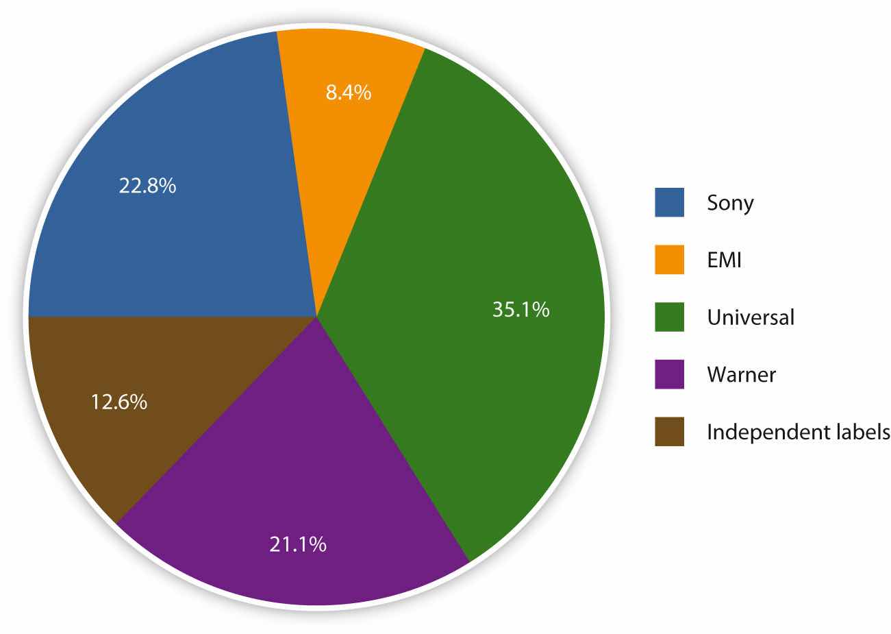 Between 1950 and 1980, a large number of major record labels and numerous independent labels competed for a share of the musical pie. Gradually, the larger labels began buying up the independent labels, and then started trying to purchase each other. By the late 1990s, only six major labels remained: Warner, Universal, Sony, BMG, EMI, and Polygram. In 1998, Universal acquired Polygram, and 6 years later Sony and BMG merged. Sony later bought out BMG to obtain sole ownership of the company. Currently, the music industry is dominated by the so-called Big FourTerm used in the music industry to refer to the four major record labels: Universal Music Group, EMI, Warner Music Group, and Sony Music Entertainment.: Sony Music Entertainment, EMI, Universal Music Group, and Warner Music Group. The Big Four control over 85 percent of the U.S. recording music industry.“The Big Four Record Companies,” Copyright Law, Treaties and Advice, http://www.copynot.org/Pages/The%20big%20four%20Record%20Companies.html. Figure 6.11 shows a graph of the current distribution of market share.