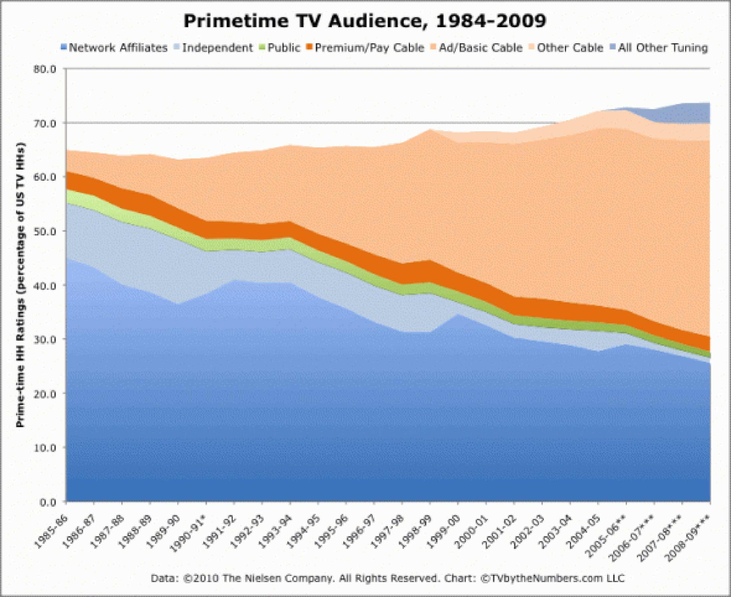 Despite responding to challenges from cable, the broadcast networks’ share of the total audience has declined each year. Between 2000 and 2009, the networks saw their numbers drop by around 8 million viewers.Robert Bianco, “The Decade in Television: Cable, the Internet Become Players,” USA Today, December 29, 2009, http://www.usatoday.com/life/television/news/2009-12-28-decadeTV28_CV_N.htm.