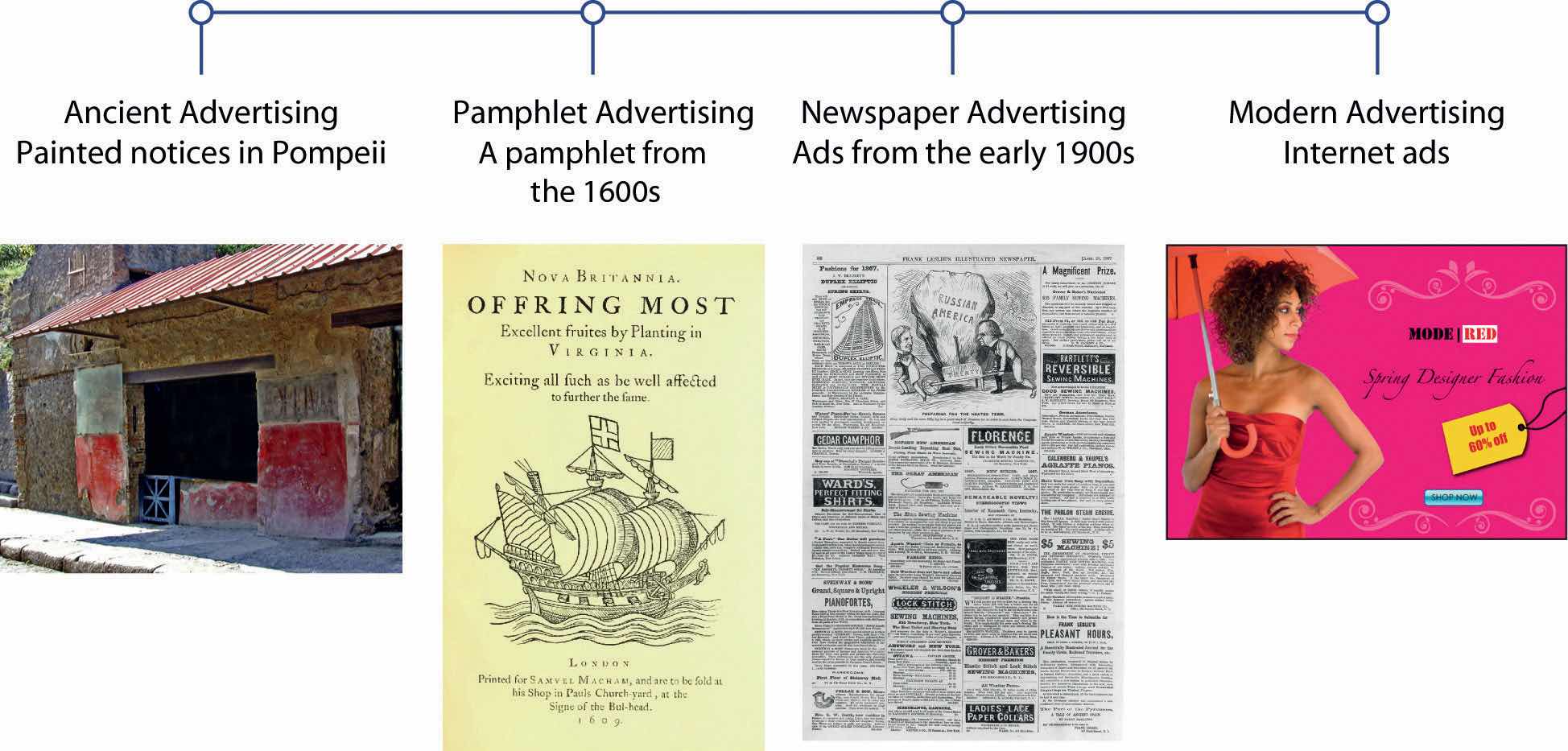 In 79 CE, the eruption of Italy’s Mount Vesuvius destroyed and, ultimately, preserved the ancient city of Pompeii. Historians have used the city’s archaeological evidence to piece together many aspects of ancient life. Pompeii’s ruins reveal a world in which the fundamental tenets of commerce and advertising were already in place. Merchants offered different brands of fish sauces identified by various names such as “Scaurus’ tunny jelly.” Wines were branded as well, and their manufacturers sought to position them by making claims about their prestige and quality. Toys and other merchandise found in the city bear the names of famous athletes, providing, perhaps, the first example of endorsement techniques.John Hood, Selling the Dream: Why Advertising Is Good Business (Westport, CT: Praeger, 2005), 12–13.