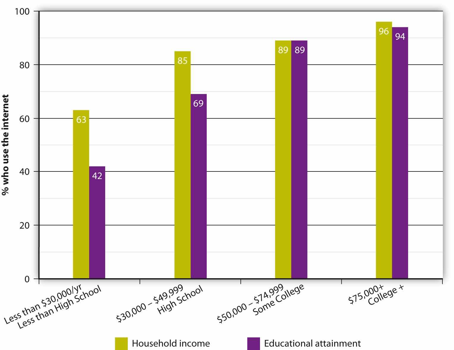 Along with practical disadvantages, the Internet also has several economic disadvantages. An increasing gap between people who can afford personal computers and access to the web and people who cannot, known as the digital divide, separates the haves and the have-nots. Although about 75 percent of U.S. households are connected to the Internet, there are gaps in access in terms of age, income, and education. For example, a recent study found that 93 percent of people age 18–29 have Internet access, compared with 70 percent of people 50–64 and just 38 percent of people over 65.Pew Research Center, “Demographics of Internet Users,” Pew Internet & American Life Project, January 6, 2010, http://www.pewinternet.org/Static-Pages/Trend-Data/Whos-Online.aspx. Similar disparities occur with income and education (see Figure 16.2).