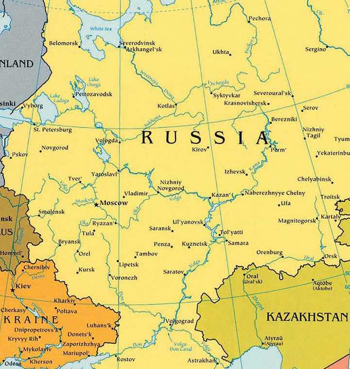 The Volga River flows through the core region of Russia, providing transportation, fresh water, and fishing. The Volga is the longest river in Europe at 2,293 miles, and it drains most of Russia’s western core region. This river has been a vital link in the transportation system of Russia for centuries and connects major industrial centers from the Moscow region to the south through an extensive network of canals and other waterways. The Volga River flows into the Caspian Sea, and a canal links the Volga with the Black Sea through a connecting canal via the Don River.