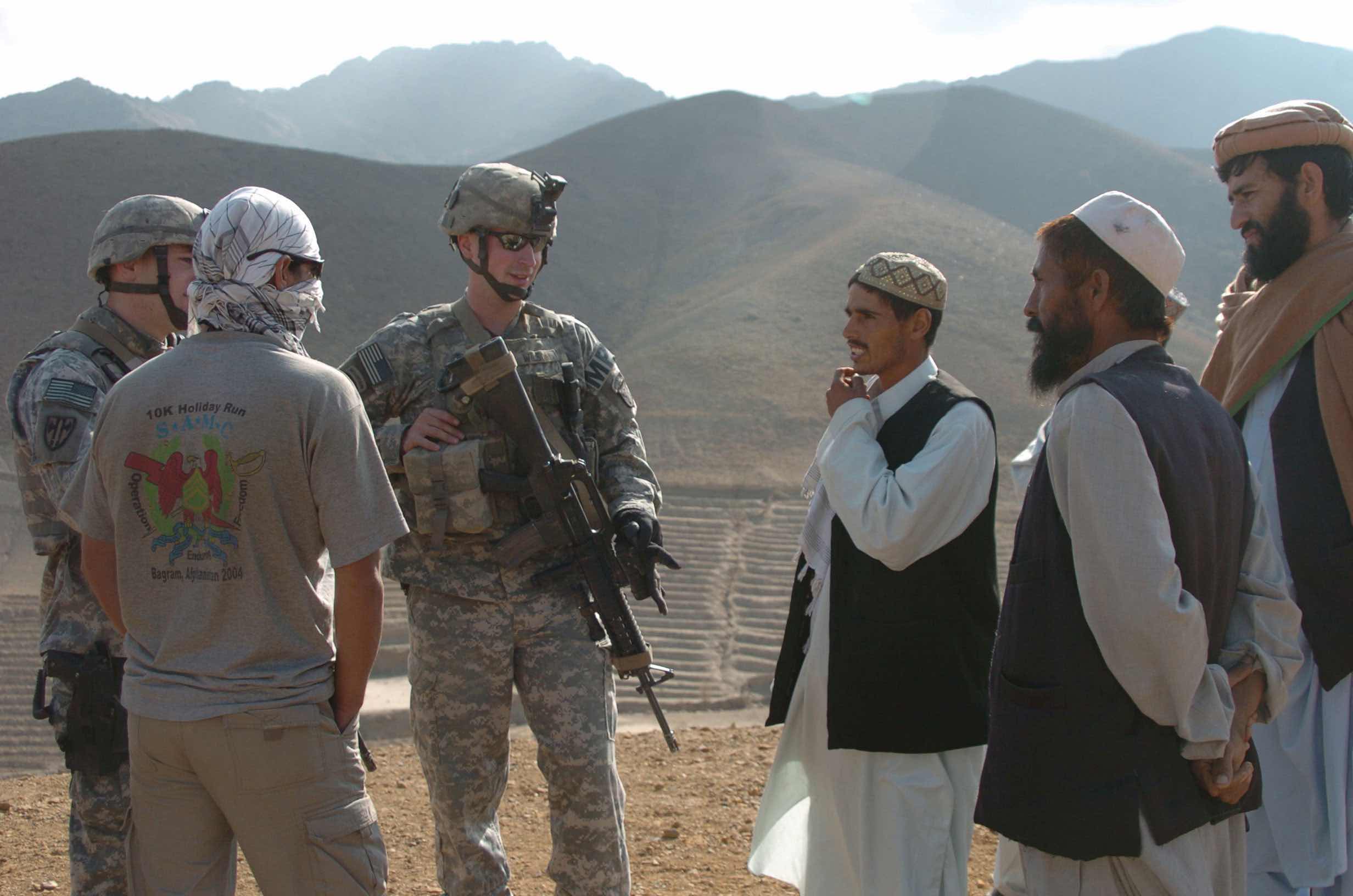 Competing groups and the rough terrain make keeping the peace in Afghanistan difficult. The United States turned control over to NATO in 2006. In this photo, soldiers representing the 561st Military Police Company, Fort Campbell, Kentucky, are speaking with local Afghans about insurgent activity near Bagram, Afghanistan.