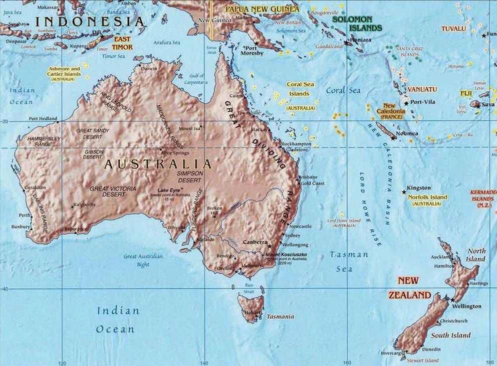 The Tropic of Capricorn runs through the middle of Australia. The Tasman Sea separates Australia from New Zealand.