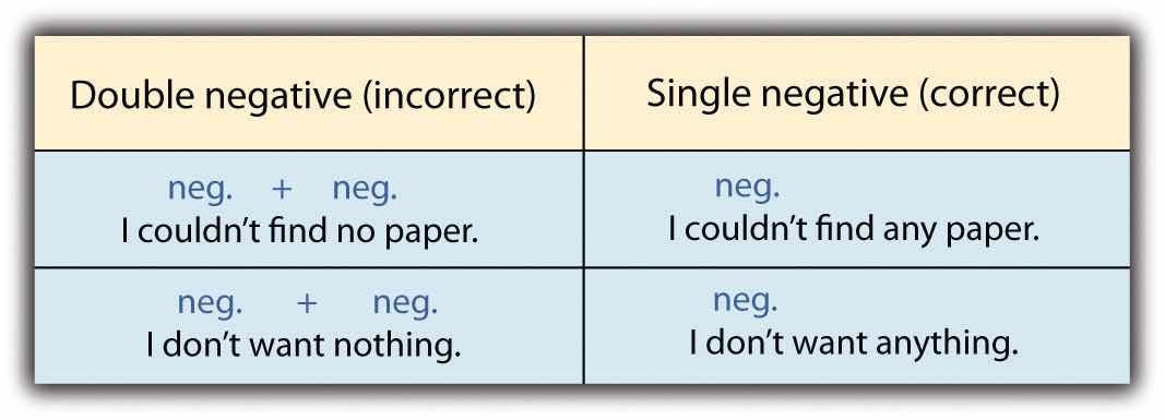 Double negativesTwo negatives used in the same phrase or sentence. are two negatives used in the same phrase or sentence. They are considered incorrect in Standard English. You should avoid using double negatives in all formal writing. If you want to say something negative, use only one negative word in the sentence. Return to the beginning of this section for a list of negative words, and then study the following examples.