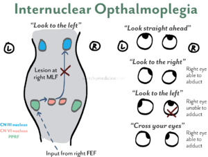- Affected eye has impaired adduction when looking contralateral (to affected eye)