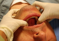 - Placed gloved thumbs in patient's mouth over the occlusal surfaces of the molars, or lateral to patient's molars in buccal fold (to avoid being bitten)